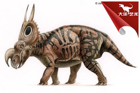 野牛龍生活在白堊紀(jì)晚期,大約6 米長(zhǎng)、1米高,頭部有三只大角,脖子上有一個(gè)大頸盾,邊緣有齒狀骨質(zhì)突起。它是由山普森(Sampson)在1994年發(fā)現(xiàn)的三個(gè)頭骨化石命名的。像其它角龍一樣,它在獸群中穿行,有牙齒,能咀嚼最硬的植物。