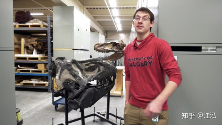 恐龍化石的發(fā)現(xiàn)還要追溯到十年前的2010年約翰·德格魯特(John De Groot)是一位農(nóng)民兼古生物愛好者,一天他在和自己的家人沿著艾伯塔省南部的弓河(Bow River)河岸散步時,偶然發(fā)現(xiàn)了一些屬于大型肉食性恐龍的頭骨化石,于是他們趕緊聯(lián)系了皇家泰勒博物館(Royal Tyrrell Museum)。博物館很快就派來了專業(yè)人員對化石進行發(fā)掘。化石殘骸具有很明顯的暴龍科恐龍的特征,有可能是屬于一頭懼龍(Daspletosaurus ),因此標本也就沒有引起太多的關注,就先堆放到了倉庫之中。