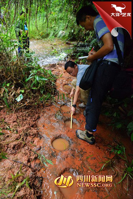 隨后,專家組對(duì)大石鄉(xiāng)新陽(yáng)村桫欏溝恐龍足跡進(jìn)行考擦,龍井和新陽(yáng)兩地相距直線距離約1500米。繼上次發(fā)現(xiàn)獸腳類恐龍的巖石上,再次發(fā)現(xiàn)蜥腳類恐龍?!斑@里保存著極好的獸腳類恐龍行跡。”獸腳類恐龍是一種兇猛的肉食性恐龍,是當(dāng)?shù)匕l(fā)現(xiàn)的蜥腳類足跡和鳥腳類足跡的造跡者的天敵。從足跡可推斷獸腳類恐龍長(zhǎng)約4-6米。生活年代在白堊紀(jì)時(shí)期,距今約一億年。