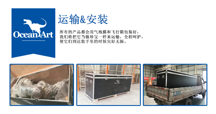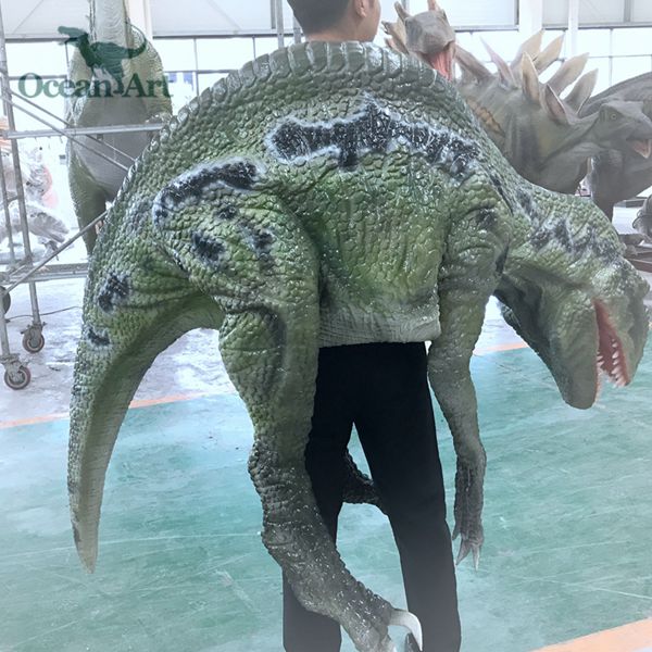 1.人控恐龍分為藏腿或露腿兩種設(shè)計,服裝長約4米,重20千克。藏腿恐龍服在腿和腹部處有一條拉鏈,當(dāng)操作者穿好后,拉上拉鏈便可完全遮住身影;露腿恐龍服則會把操作者雙腿露在外面。尾部有一條可抽出的長桿,便于裝箱運輸。另外,我們會提供一個支撐架,方便擺放恐龍服裝。